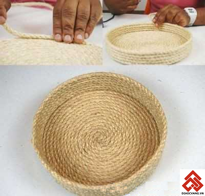 Bước 2: Khi đã hoàn thành xong bước 1 và cuốn xong đáy giỏ thì bạn đặt dây thừng lên trên đường dây thừng ngoài cùng của đáy giỏ rồi dán chặt lại. Bạn cứ cuốn dây vòng theo hình tròn của đáy giỏ, cuốn lên cao với cùng một kích thước, vừa cuộn bạn vừa dán keo để cố định, bạn cứ tiếp tục làm như vậy cho đến khi chiều cao của thành giỏ được ¼ đường kính dáy giỏ thì dừng lại.